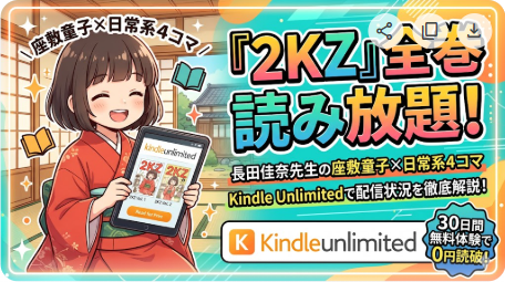 長田佳奈先生の心温まる日常系4コマ漫画『2KZ(ニケイゼット)』は、2026年3月10日時点でKindle Unlimitedの読み放題対象作品です。コミックス版と未収録集をあわせた全2巻が月額980円で読み放題、30日間の無料体験なら0円で全巻読破できます。