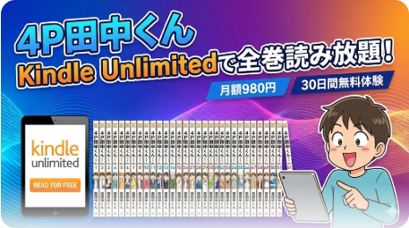 「4P田中くん」をKindle Unlimitedで読めるか気になっていませんか?結論から言うと、「4P田中くん」は全51巻すべてがKindle Unlimited読み放題の対象です。月額980円のKindle Unlimitedに登録すれば、1巻から最終51巻まで追加料金なしで一気読みできます。しかも初めての方なら30日間の無料体験が利用できるため、実質無料で全巻読破することも可能です。この記事では、配信状況の詳細から作品の魅力、読者の評判、お得な読み方まで徹底的に解説します。