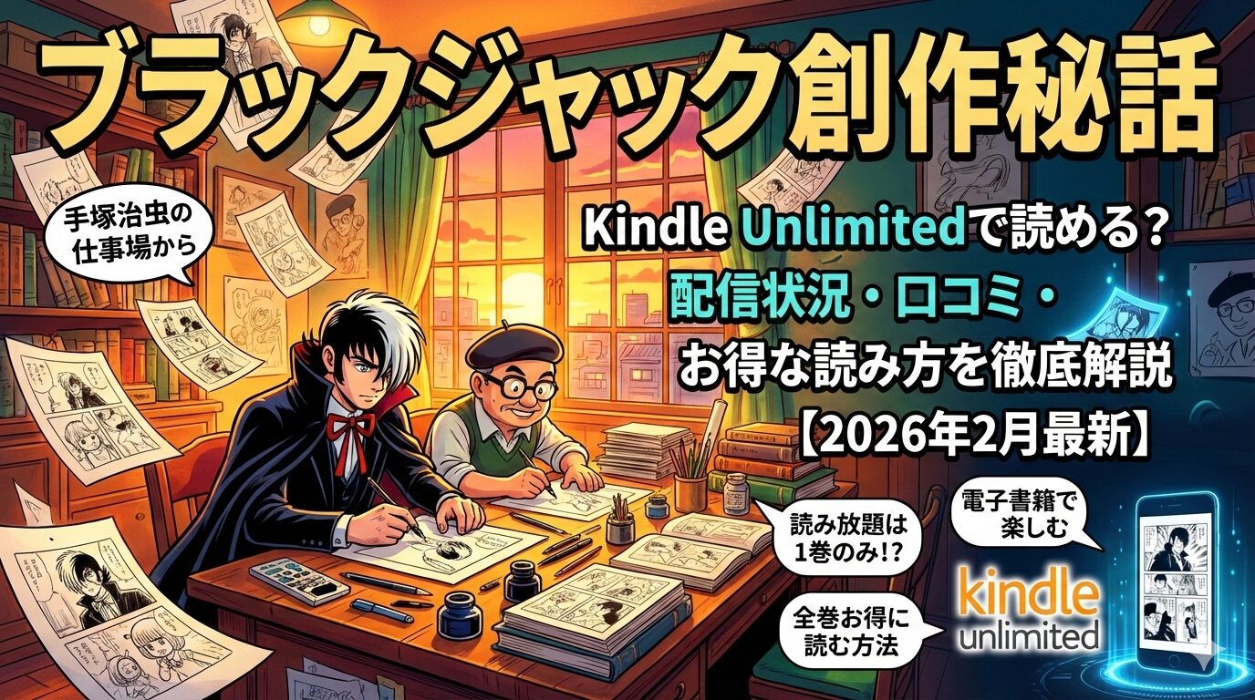 『ブラック・ジャック創作秘話 ~手塚治虫の仕事場から~』は、2026年2月時点でKindle Unlimitedの対象作品です。ただし読み放題で読めるのは第1巻のみで、2巻以降は通常購入が必要です。本記事では最新の配信状況から口コミ・見どころ・お得に全巻読む方法まで徹底解説します。