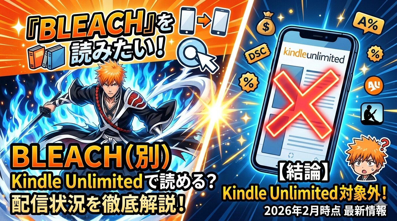 「BLEACH(別)」で検索しているあなたへ。結論から言うと、BLEACHのカラー版や関連エディションを含め、Kindle Unlimitedの読み放題対象にはなっていません。本記事では2026年2月時点の最新配信状況、全巻をお得に読む方法、読者の口コミ・評判まで徹底的に解説します。