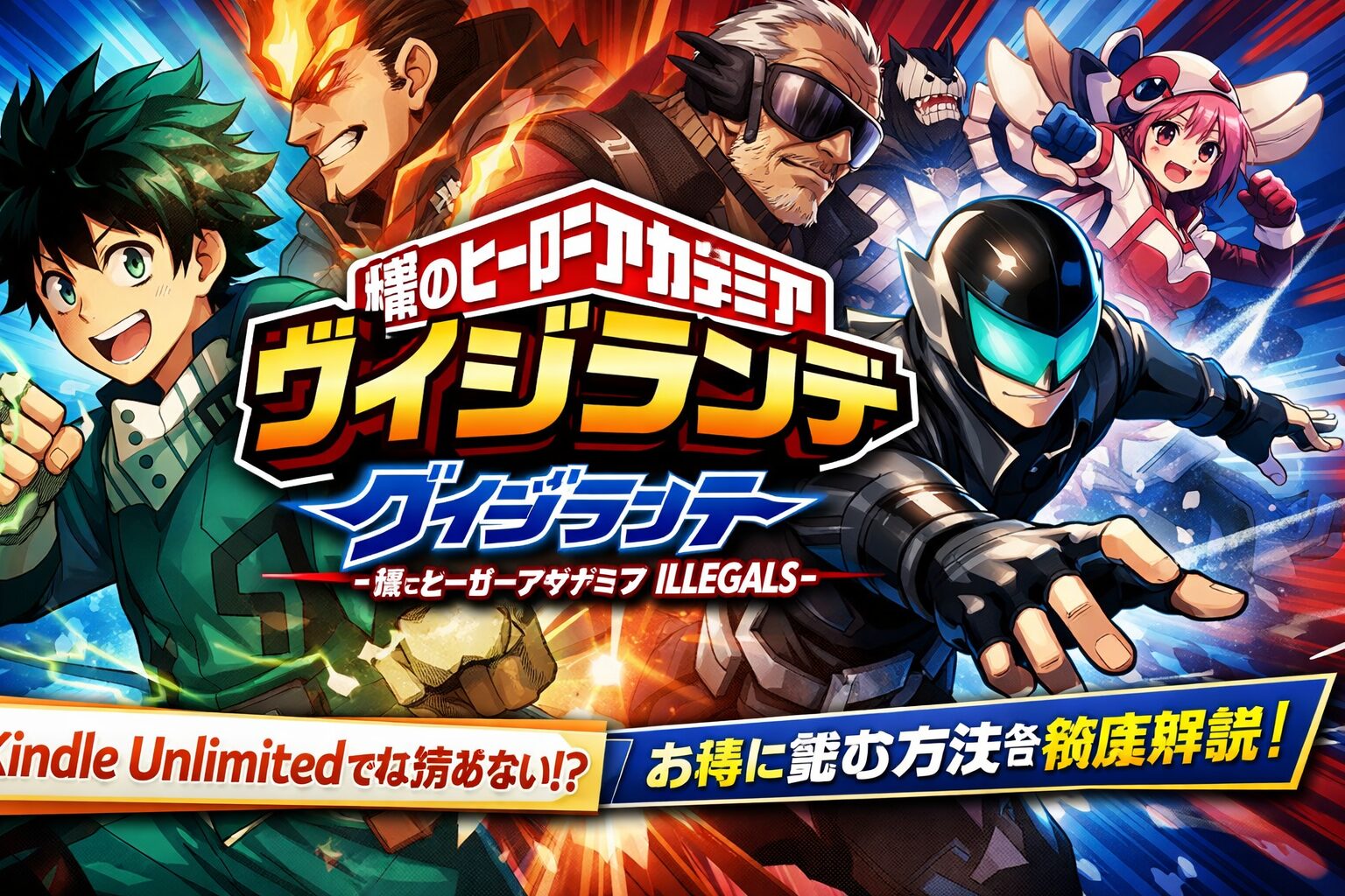 「僕のヒーローアカデミア(別)」――すなわち別天荒人作画のスピンオフ『ヴィジランテ -僕のヒーローアカデミア ILLEGALS-』は、残念ながらKindle Unlimitedの読み放題対象外です。本記事では2026年2月時点の最新配信状況をはじめ、全巻をお得に読む方法、口コミ・評判、見どころまで徹底解説します。