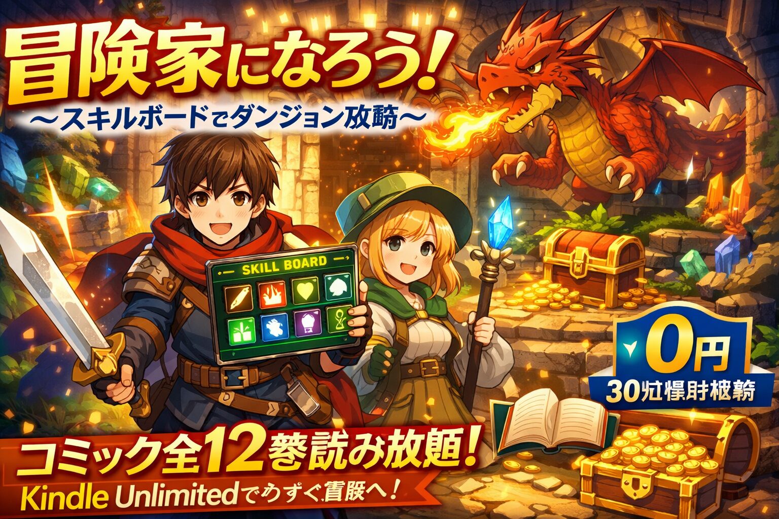 「冒険家になろう!〜スキルボードでダンジョン攻略〜」は、Kindle Unlimitedならコミック版全12巻が読み放題で一気読みできます。月額980円(税込)で全巻楽しめるうえ、30日間の無料体験もあるため、実質0円で読破することも可能です。