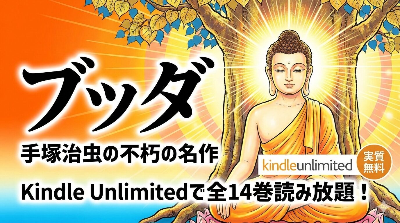 2026年2月時点の確認で、手塚治虫『ブッダ』Kindle版(全14巻/手塚プロダクション刊)はKindle Unlimitedの読み放題対象作品です。通常のKindle版だけでなく、カラー版(全14巻)も同様に対象となっています。全巻を通常購入した場合の合計は約4,158円(税込)ですので、月額980円のKindle Unlimitedに加入すれば約3,178円以上お得に読むことができます。