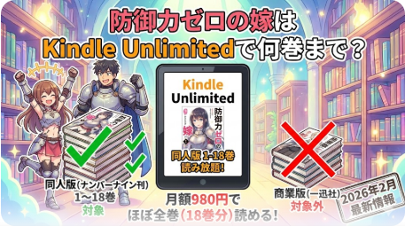 防御力ゼロの嫁はKindle Unlimitedで同人版1〜18巻が読み放題対象です。商業版は対象外。2026年2月時点の最新情報をもとに、対象巻の詳細やお得に全巻読む方法をわかりやすく解説します。