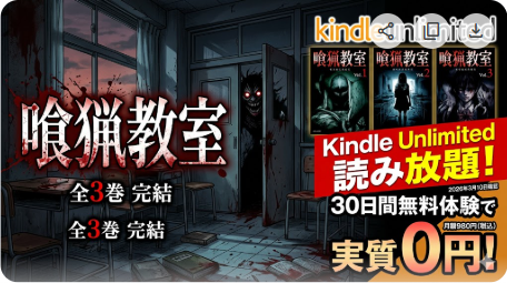 「喰猟教室」は、人を喰う化け物が潜む教室を舞台にした全3巻完結のホラーサスペンス漫画です。2026年3月現在、Kindle Unlimitedの読み放題対象として全巻配信されており、月額980円(税込)で一気読みが可能です。30日間の無料体験を利用すれば、実質無料... -