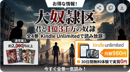 「大奴隷区 君と1億3千万の奴隷」をお得に読みたい方に朗報です。2026年3月10日時点で、本作は全4巻すべてがKindle Unlimitedの読み放題対象となっています。通常購入すると全巻で約2,000円以上かかるところ、月額980円(税込)のKindle Unlimitedなら全巻... -