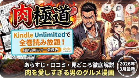 「肉極道」はKindle Unlimitedで全巻読み放題!あらすじ・口コミ・見どころを徹底解説【2026年3月最新】 「肉極道」は、肉を愛しすぎるヤクザ風の謎の男が、肉料理食堂の若き店主を指導する本格グルメ漫画です。2026年3月現在、Kindle Unlimitedなら全5巻... -