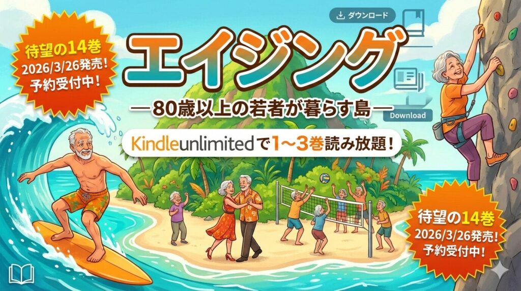 「エイジング―80歳以上の若者が暮らす島―」はKindle Unlimitedで1〜3巻が読み放題対象です。月額980円(税込)のKindle Unlimitedに登録すれば、30日間の無料体験中に3巻分を0円で一気読みできます。2026年3月26日には待望の14巻も発売予定で、今まさに注... -