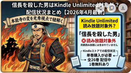 信長を殺した男はKindle Unlimited対象外?配信状況まとめ【2026年4月最新】 『信長を殺した男』は2026年4月12日時点でKindle Unlimitedの読み放題対象外です。読む方法はKindleストアでの単巻購入が基本になります。本能寺の変を通説ではなく明智光秀側か... -