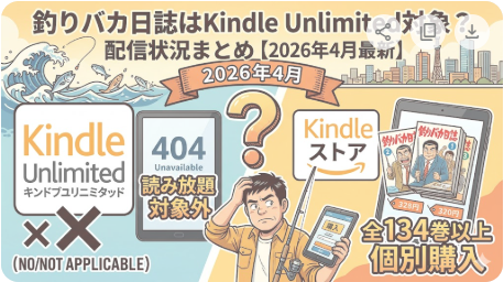 釣りバカ日誌はKindle Unlimited対象?配信状況まとめ【2026年4月最新】 『釣りバカ日誌』は2026年4月12日時点でKindle Unlimitedの読み放題対象外です。Kindleストアでは全134巻以上を購入できる一方、読み放題で一気読みする形には対応していません。ま... -