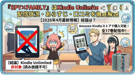 『SPY×FAMILY』はKindle Unlimitedで読める?配信状況・あらすじ・口コミを徹底解説【2026年4月最新】結論からお伝えすると、『SPY×FAMILY』は現在Kindle Unlimitedの読み放題対象外です。ただし、AmazonのKindleストアで購入できるほか、TVアニメの放送が...