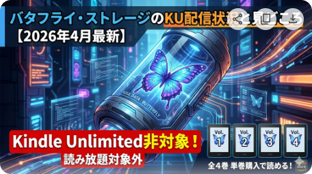 バタフライ・ストレージのKU配信状況と見どころ【2026年4月最新】 『バタフライ・ストレージ』は、2026年4月11日時点でKindle Unlimitedの読み放題対象ではありません。Kindleストアで全4巻を単巻購入する形です。魂を「蝶」として保存する設定がかなり強... -