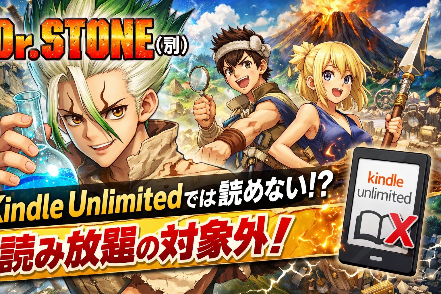 「Dr.STONEをKindle Unlimitedで読みたい」と考えている方へ、結論からお伝えします。2026年2月現在、Dr.STONEはKindle Unlimitedの読み放題対象外です。全27巻いずれも対象に含まれていません。本記事では、配信状況の詳細に加え、電子書籍で最もお得に読む方法、口コミ・評判、作品の見どころまで網羅的に解説します。