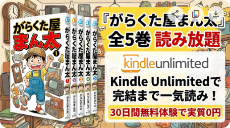 「がらくた屋まん太」は全5巻すべてがKindle Unlimitedの読み放題対象です。月額980円(税込)のKindle Unlimitedに登録すれば、完結済みの本作を追加費用なしで一気読みできます。30日間の無料体験を利用すれば、0円で全巻読破することも可能です。