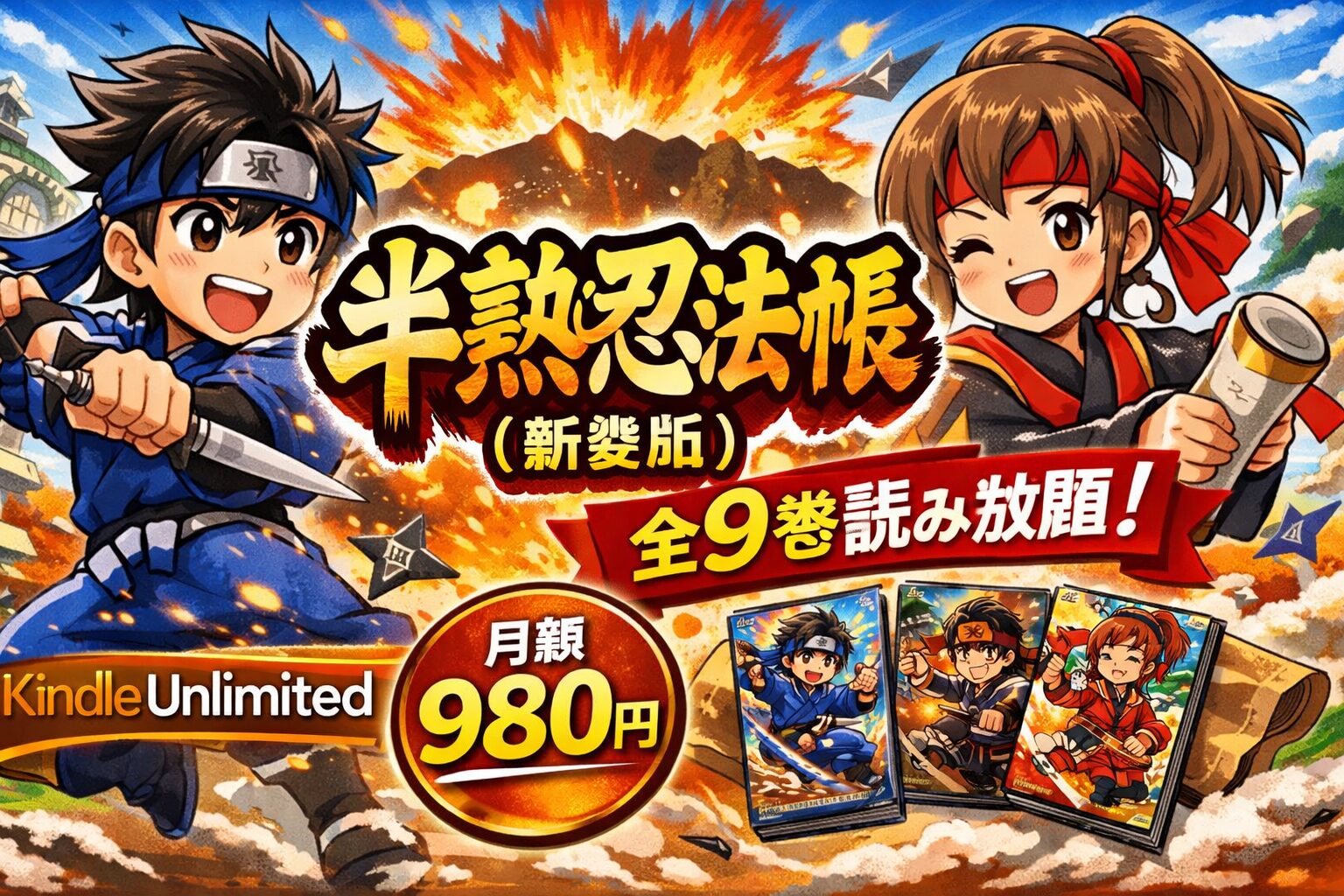 2026年2月16日時点で、『半熟忍法帳(新装版)』全9巻(完結)がKindle Unlimitedの読み放題対象となっています。Kindle Unlimited会員であれば、追加料金なしで全巻を読むことが可能です。