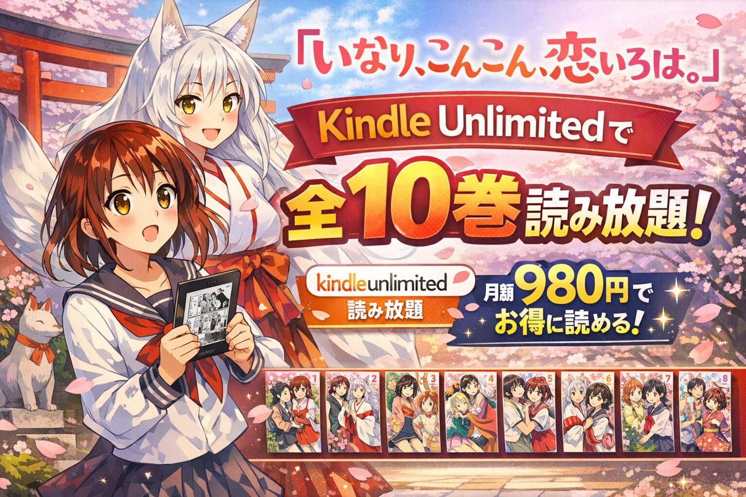「いなり、こんこん、恋いろは。」は、京都・伏見を舞台にした和風ラブコメディの名作漫画です。2026年3月時点の確認で、全10巻すべてがKindle Unlimitedの読み放題対象として配信されています。通常購入なら全巻で約6,380円かかるところ、月額980円(税込)で全巻読破できるため非常にお得です。