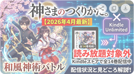 『神さまのつくりかた。』は2026年4月17日時点でKindle Unlimitedの読み放題対象外でした。いま読むなら、Kindleストアで全14巻を買って追う形です。和風神術バトルとラブコメの熱が最後まで通っているので、完結済み作品をまとめて読みたい人にはかなり刺さります。