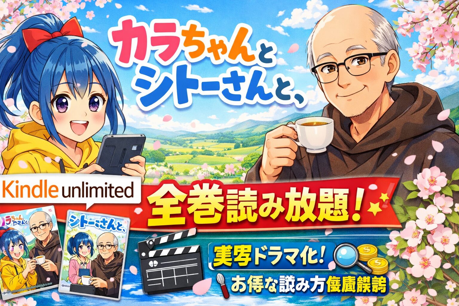 「カラちゃんとシトーさんと、」は、2026年3月時点でKindle Unlimitedの読み放題対象作品です。単行本全2巻および分冊版全23話すべてが追加料金なしで読めます。2026年3月28日からは実写ドラマの配信も控えており、今こそ原作を読んでおきたいタイミングです。
