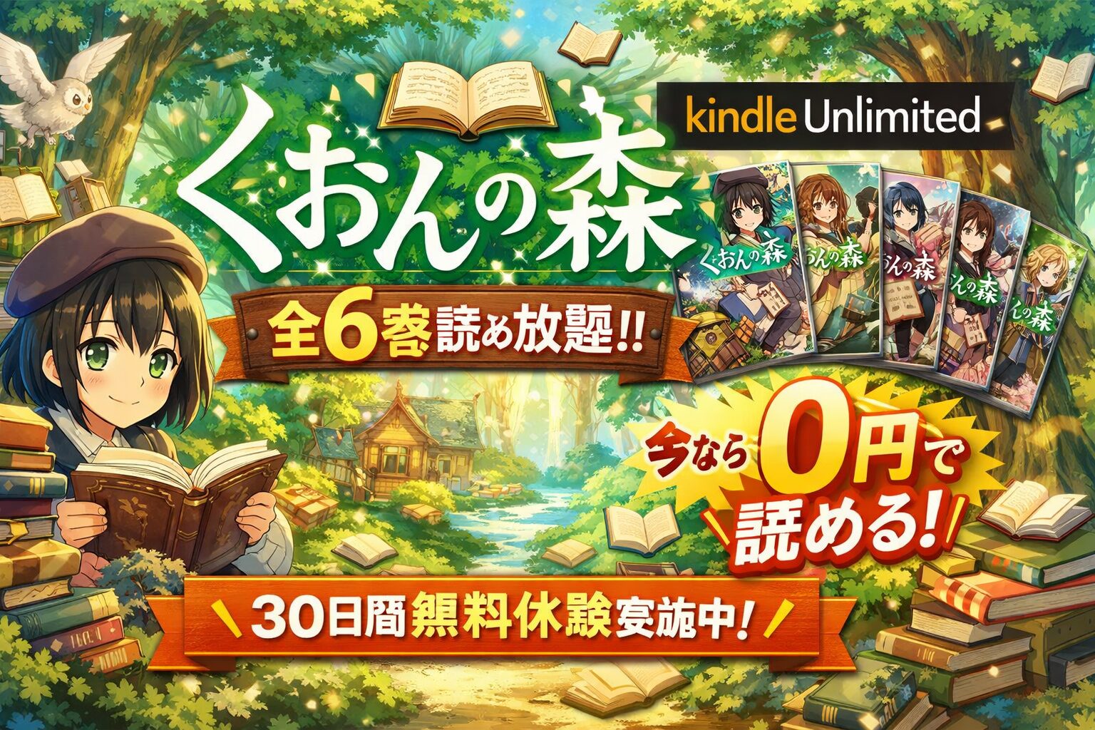 釣巻和が描く”本づくしファンタジー”「くおんの森」は、2026年2月17日時点で全6巻すべてがKindle Unlimited読み放題の対象です。通常購入なら合計3,410円かかるところ、Kindle Unlimitedなら月額980円で全巻読破可能。さらに30日間の無料体験を使えば、0円で最終巻まで一気に楽しめます。