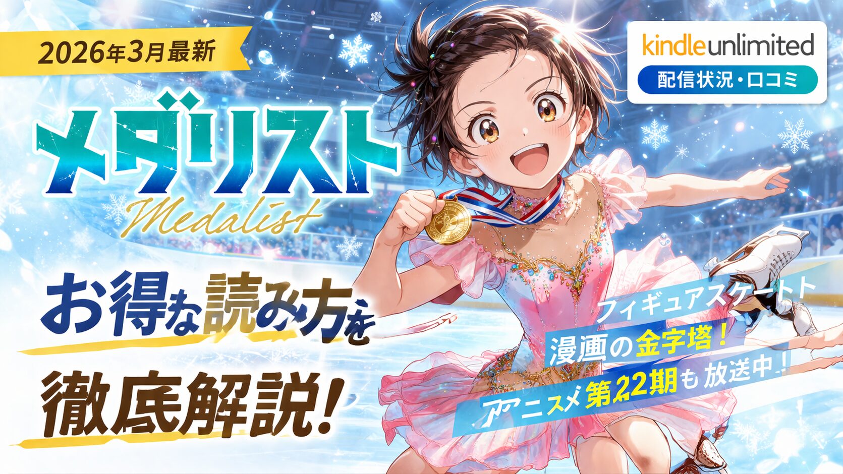 フィギュアスケート漫画「メダリスト」は、Kindle Unlimitedの読み放題対象として1巻が配信された実績がある注目作品です。2026年3月現在、全14巻が発売中で、アニメ第2期も放送中の大人気作。この記事では配信状況やお得な読み方を詳しく解説します。