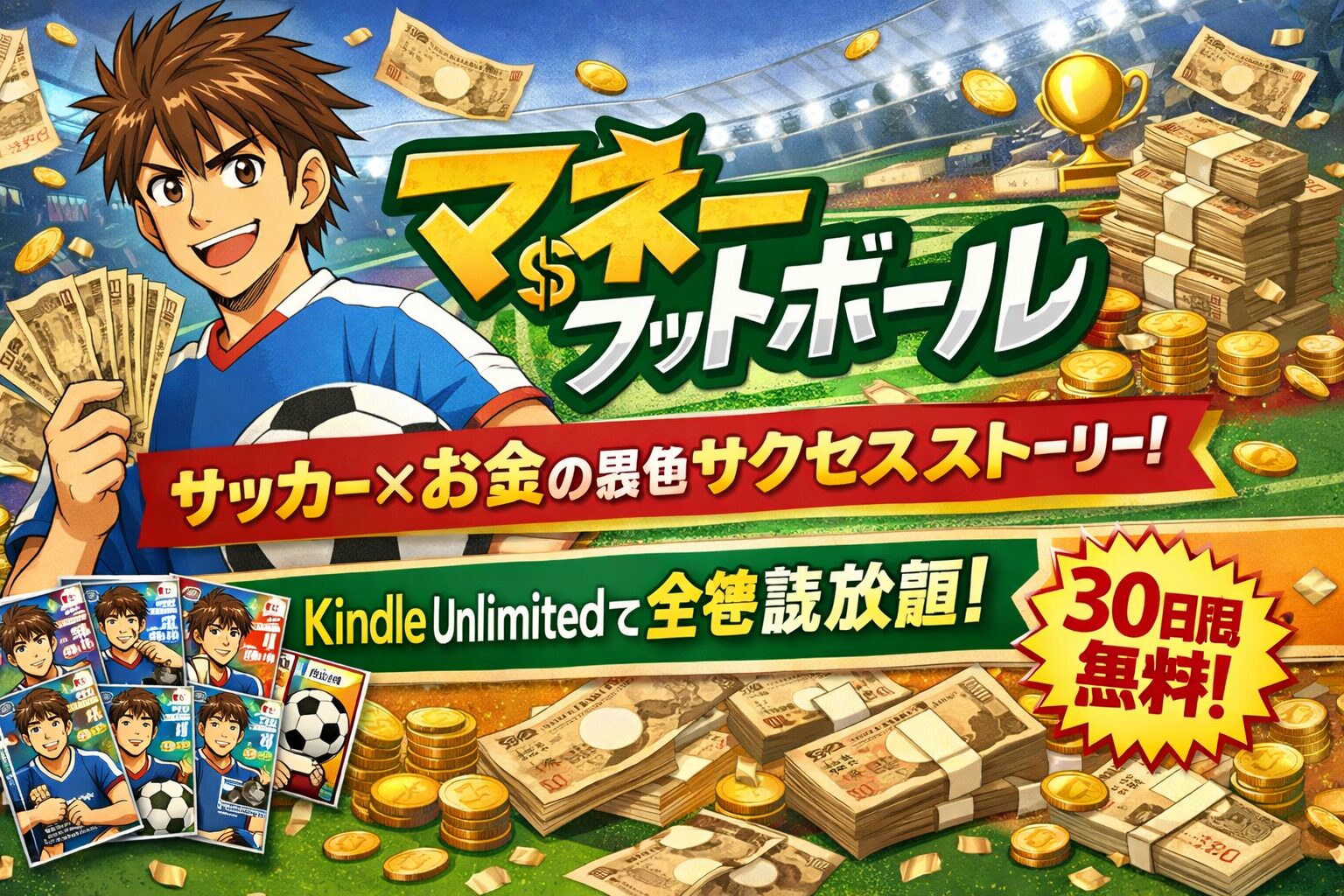「マネーフットボール」は、能田達規先生によるサッカー×お金をテーマにした異色の青年漫画です。2026年3月現在、Kindle Unlimitedで全7巻が読み放題対象となっており、月額980円(税込)で完結まで一気読みできます。30日間の無料体験を利用すれば、実質無料で全巻楽しむことも可能です。
