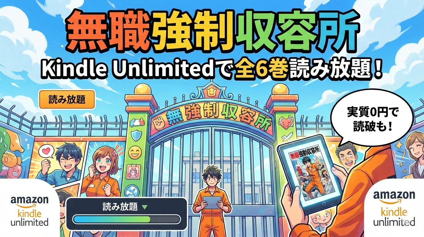 「無職強制収容所」は2026年2月現在、Kindle Unlimitedで全6巻すべてが読み放題対象です。通常購入なら全巻で3,960円かかるところ、月額980円のKindle Unlimitedに登録するだけで完結まで一気読みできます。30日間の無料体験を使えば、実質0円で全巻読破も可能です。