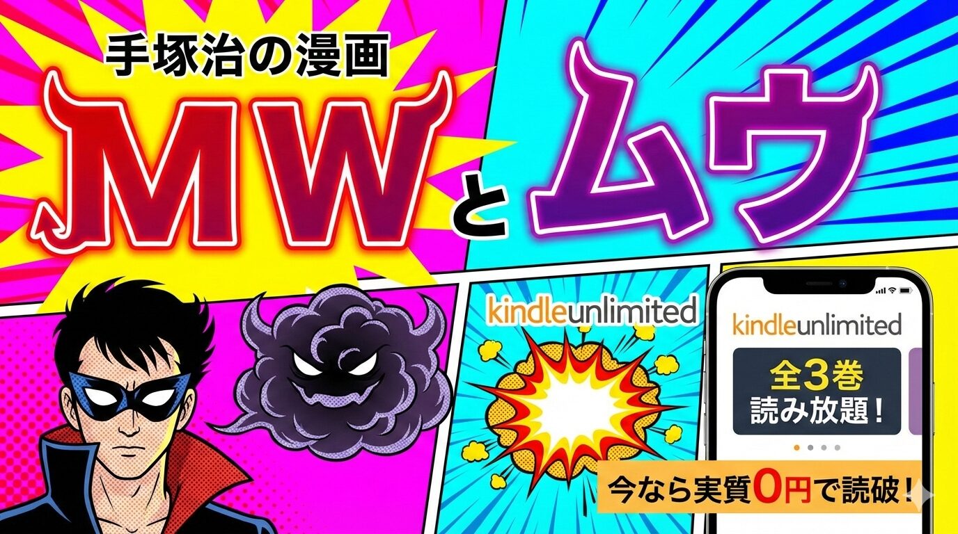 手塚治虫の問題作『MW(ムウ)』は、2026年2月時点でKindle Unlimitedの読み放題対象です。全3巻すべてが月額980円(税込)の範囲で読めるため、通常購入(合計約891円)よりもお得に楽しめます。30日間の無料体験を利用すれば、実質0円で全巻読破も可能です。