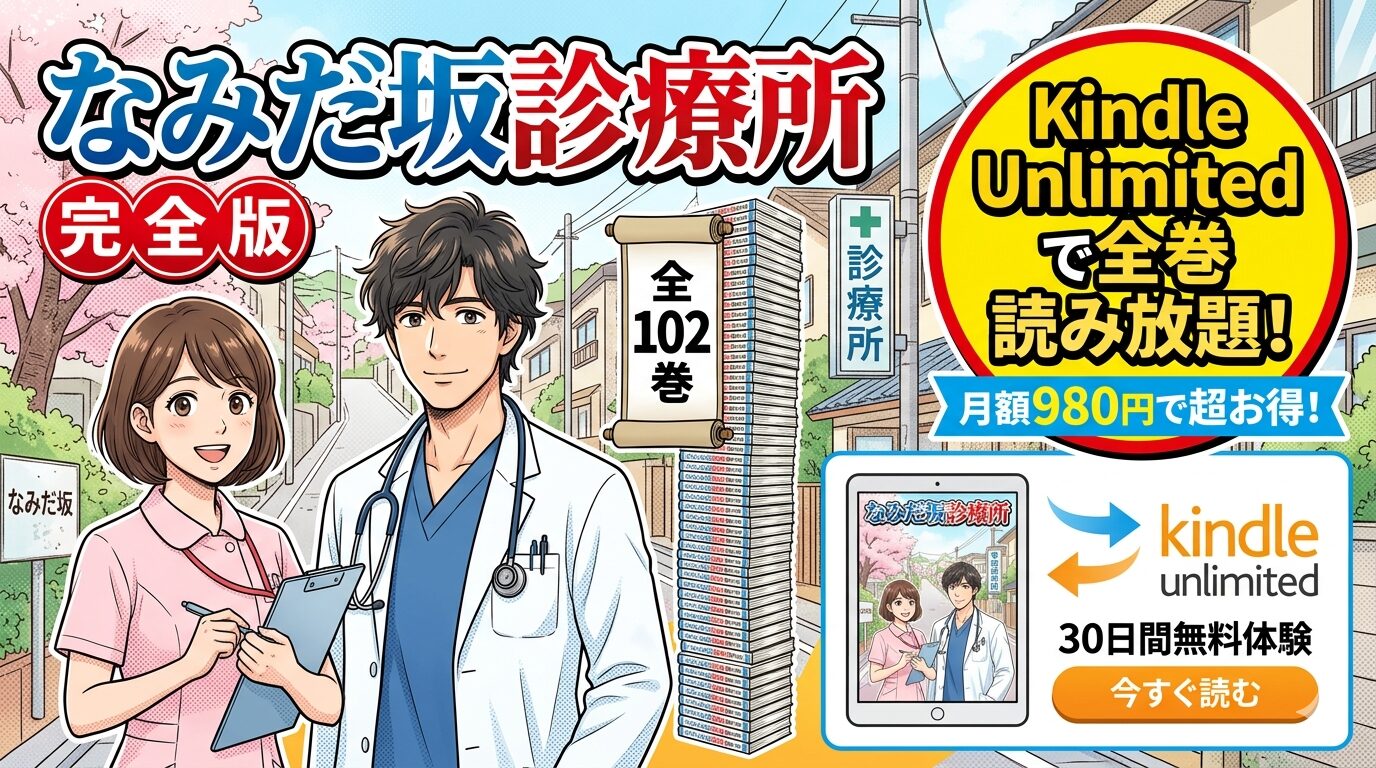 「なみだ坂診療所 完全版」全102巻は、2026年3月時点で Kindle Unlimited の読み放題対象として配信されています。通常購入では1巻あたり約446円、全巻で約45,000円以上かかるところ、月額980円の Kindle Unlimited なら全巻読み放題。30日間の無料体験を使えば0円で読み始められます。