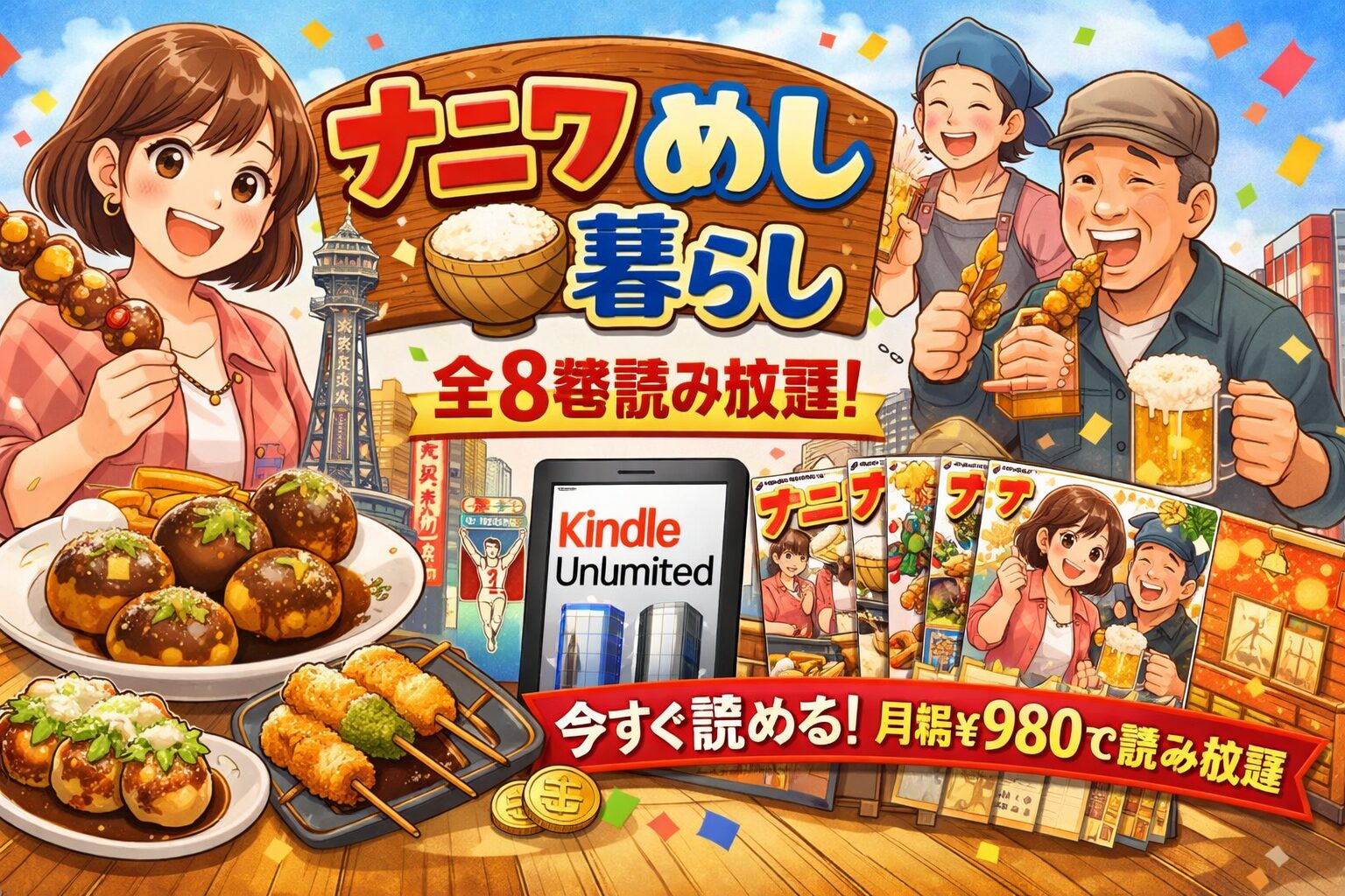 「ナニワめし暮らし」は、はたのさとし先生による大阪人情グルメ漫画で、全8巻が完結済みです。2026年3月現在、Kindle Unlimitedの読み放題対象作品となっており、月額980円(税込)で全巻を一気読みできます。大阪のB級グルメと人情味あふれるストーリーを楽しみたい方に最適です。