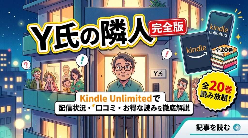 「Y氏の隣人 完全版」はKindle Unlimitedで全20巻読み放題!配信状況・口コミ・お得な読み方を徹底解説【2026年最新】 「Y氏の隣人 完全版」は、2026年3月現在、Kindle Unlimitedで全20巻すべてが読み放題対象です。通常購入なら全巻で約8,360円かかるとこ... -