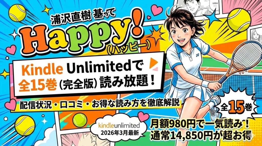 「Happy!(ハッピー)」はKindle Unlimitedで全15巻(完全版)読み放題!配信状況・口コミ・お得な読み方を徹底解説【2026年3月最新】 浦沢直樹の名作テニス漫画「Happy!(ハッピー)」は、2026年3月時点でKindle Unlimitedの読み放題対象作品です。完全版... -