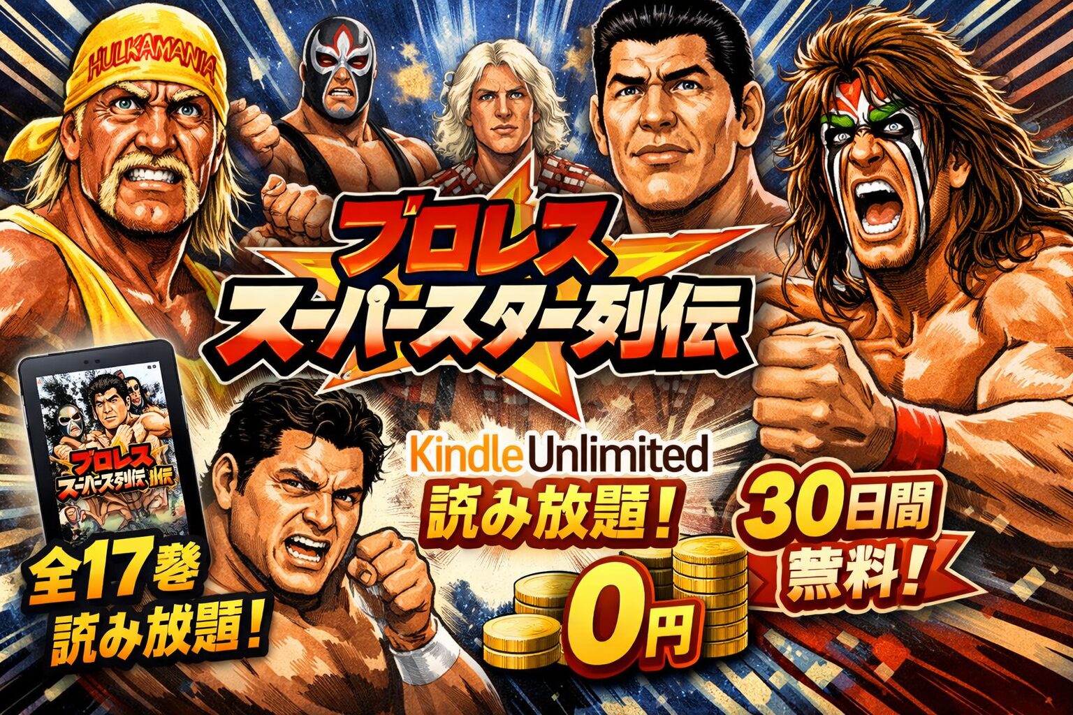 2026年3月10日現在、『プロレススーパースター列伝』のデジタルリマスター版は全17巻すべてがKindle Unlimited読み放題の対象作品です。通常購入すると全巻で約5,000円以上かかりますが、Kindle Unlimitedなら月額980円(税込)で全巻読み放題。さらに、30日間の無料体験を利用すれば、期間中は実質0円で全巻を読破できます。