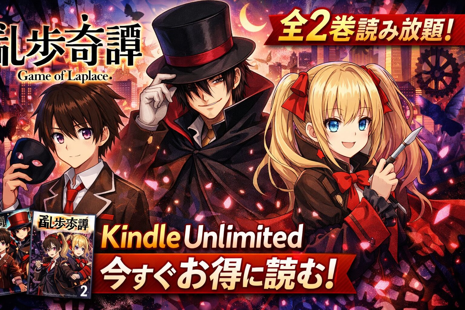 「乱歩奇譚 Game of Laplace」の漫画版(全2巻)をお得に読みたい方へ。2026年3月10日時点の確認では、本作はKindle Unlimitedの読み放題対象として配信されています。通常購入なら約1,496円かかるところ、月額980円のKindle Unlimitedなら全2巻を追加料金なしで一気読みできます。