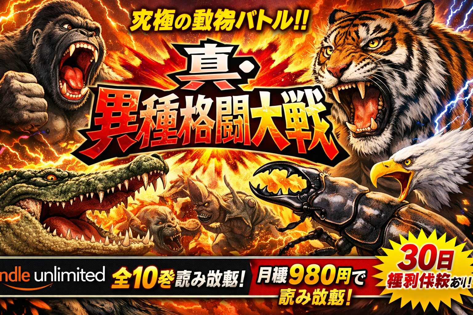 「真・異種格闘大戦」は、相原コージ先生が描く前代未聞の動物格闘漫画です。全10巻完結済みで、2026年3月現在、Kindle Unlimitedで全巻読み放題の対象となっています。月額980円(税込)で全巻一気読みできるため、通常購入よりも圧倒的にお得です。