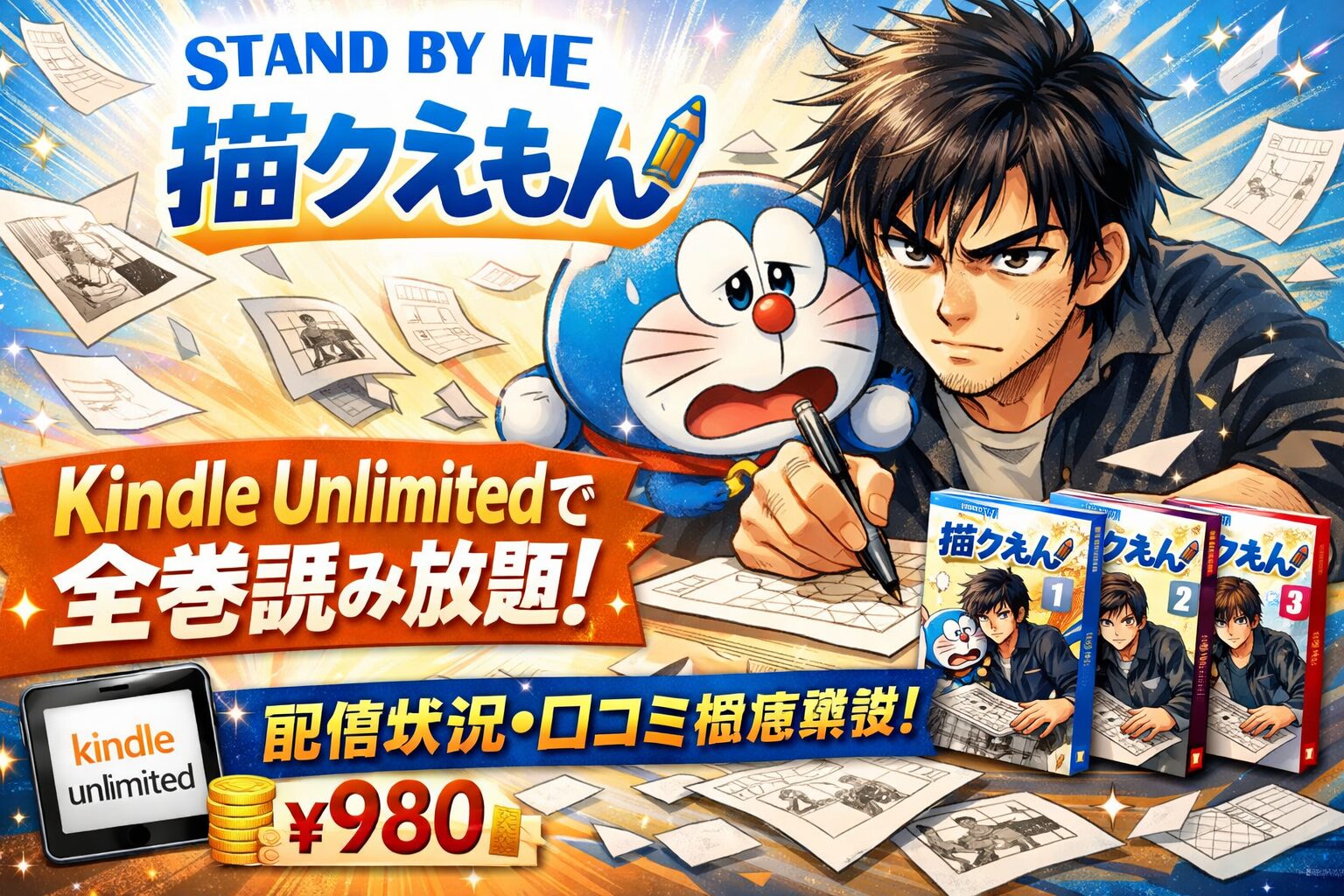 Kindle Unlimitedなら、「Stand by me 描クえもん」の単行本全3巻が月額980円(税込)の読み放題で楽しめます。通常購入だと全3巻セットで1,188円(税込)かかるため、Kindle Unlimitedで読めば約200円お得です。さらに30日間の無料体験を利用すれば、実質0円で全巻読破が可能です。
