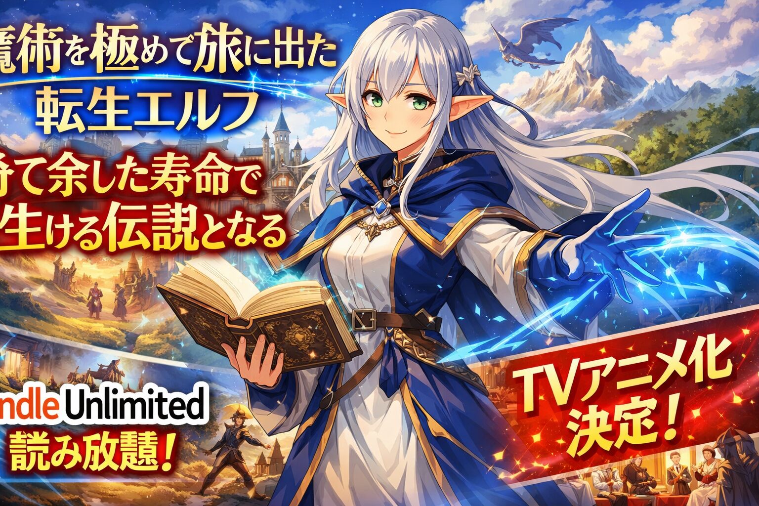 「魔術を極めて旅に出た転生エルフ、持て余した寿命で生ける伝説となる」は、2026年2月時点でKindle Unlimitedの読み放題対象作品です。TVアニメ化も決定し注目度が急上昇中の本作を、月額980円(税込)で今すぐ読み始められます。この記事では配信状況や口コミ、最もお得に全巻読む方法まで徹底的にまとめました。