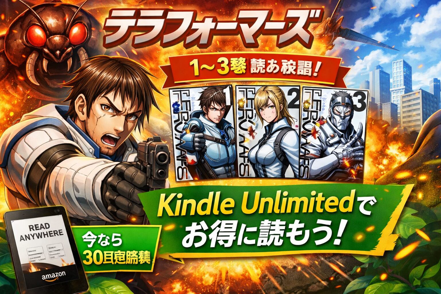 「テラフォーマーズ」は、Kindle Unlimitedで1巻〜3巻が読み放題対象です。月額980円(税込)で序盤のストーリーをじっくり楽しめます。累計2200万部を突破した大人気SFバトル漫画を、まずは無料体験でお得に読み始めましょう。