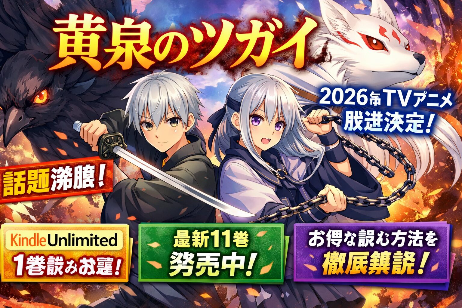 荒川弘先生の最新作「黄泉のツガイ」は、2026年2月現在Kindle Unlimitedで1巻が読み放題対象です。2026年4月のTVアニメ放送開始を控え注目度が急上昇中の本作について、配信状況・全巻のお得な読み方・口コミ・見どころをまとめました。