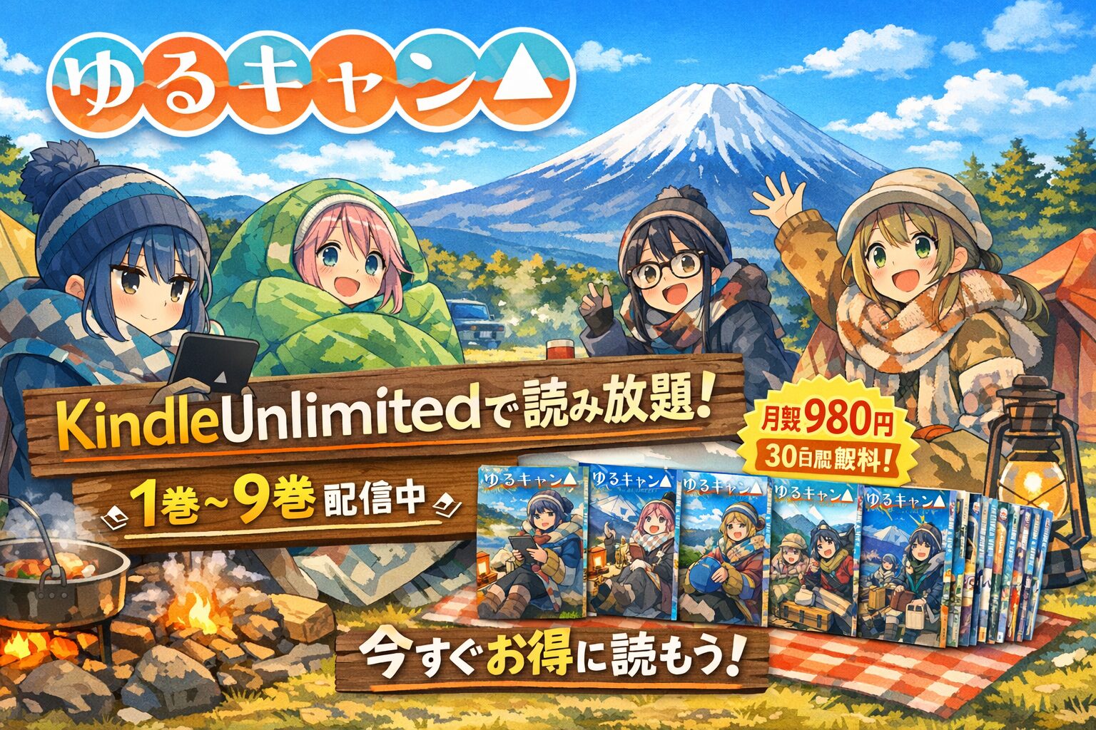 人気キャンプ漫画「ゆるキャン△」をお得に読みたい方へ。結論からお伝えすると、「ゆるキャン△」はKindle Unlimitedで1巻〜9巻が読み放題対象です。月額980円(税込)で、通常購入なら5,000円以上かかる9巻分が追加料金なしで楽しめます。30日間の無料体験を利用すれば、実質0円で読み始めることも可能です。